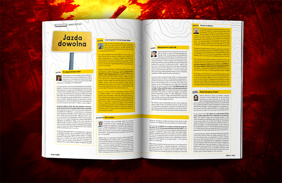 Dział publicystyki obejmuje kilkanaście artykułów zajmujących blisko 50 stron, jest więc w czym wybierać. Jak zwykle sporo jest artykułów rocznicowych, jak 20 lat God of War, 25 lat Tony Hawk’s Pro Skater 2 czy 40 lat Atari ST. Jako Amigowiec szczególnie ten ostatni art, napisany przez fana „kompa na węgiel” Bartka Kluskę, przeczytam z zainteresowaniem. Ciekawie zapowiada się też kolejny odcinek analizy branży gier w danym kraju, tym razem padło na Kanadę. No jest i tekst o świetnym GeoGuessr – podziwiam pomysł i jako olimpijczyk z geografii i fan Szklarskiego mam ochotę zagrać, ale boję się że wsiąknę, stąd wciąż się waham. Poza tym na pewno skonsumuję teksty o Ciemnym Południu, słowiańskości w grach (nie, nie tylko o Wiedźminie) i oczekiwaniu na GTA VI (wiem, wytarty temat, ale kto na tego szpila nie czeka?!). A na deser pójdzie cała reszta.