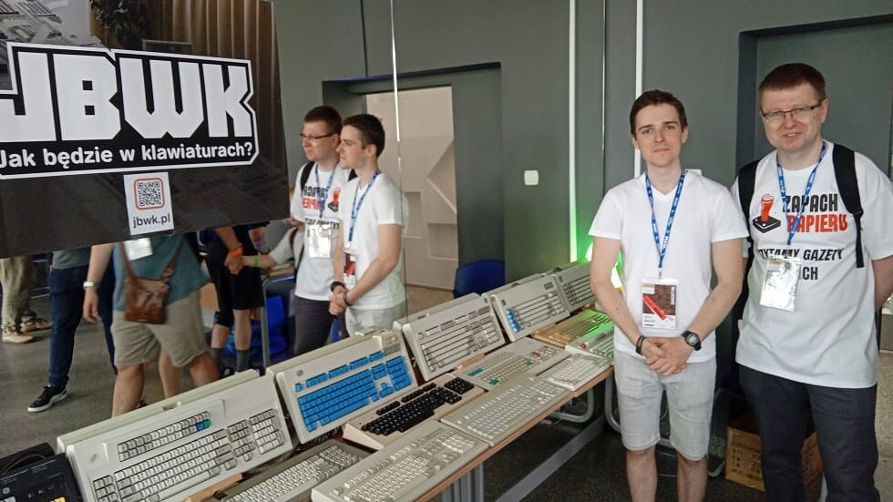 Wystawcy. Mniej liczni niż podczas naszego ostatniego pobytu. Łatwo to było stwierdzić bo kilka sal, które kiedyś zwiedzaliśmy, teraz było zamkniętych. Doskwierał brak fliperów (te podróbki… proszę) i oryginalnych maszyn arcade. Braki starały się zrekompensować konsole i retrokomputery, na których można było pograć. Podobało nam się pomieszczenie z mnóstwem plastikowych spluw i sala piłkarska, gdzie na wielkim telewizorze można było zagrać w Sensible Soccer. Oczywiście musieliśmy spróbować. Jak samopoczucie, Junior? 🙂 Jeśli chodzi o sklepy i wydawców to zabrakło kilku znanych marek, część stałych bywalców jednak się pojawiła (m.in. Retronics czy K&A Plus). Jak zwykle sporo było indyczych twórców gier, których produkcje można było sprawdzić w akcji (pozdrowienia dla autora podróbki Airwolfa – fajna). Nasze serca skradła wystawa klawiatur komputerowych. Junior nie mógł się oderwać od maszyny do pisania, a Kambr Ordowik rywalizował ze mną w pisaniu na czas. Chyba wygrał, nie pamiętam dokładnie 😉 Pamiętam za to że kupiłem sobie świeczkę zapachową, prawdziwą, nie komputerową.
