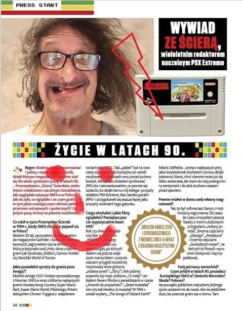 Publicystyka w magazynie umieszczona jest w kilku działach: Tutorial, Press Start, Secret Level (he he…) i Credits. Generalnie znajdziecie tu artykuły podobne co w poprzednich wydaniach, szablon tematyczny się nie zmienił, zmienił się tylko sprzęt. Roger zdecydował się na dłuższe artykuły, zajmujące 2-5 stron, przez co zagadnień jest mniej, za to opisane są rzetelniej. Są tacy co lubią takie podejście, inni, jak ja preferują makarony. No dobra, co więc tutaj mamy? Tradycyjnie wspomnienia autorów, historię SNES-a, teksty o popularności konsoli w Polsce (ktoś to w ogóle dystrybuował?), szalonej premierze w Japonii i wojnie z Segą, a poza tym opisy akcesoriów (przystawki, mysz, pistolet itp.), nowe modeli, romhacki, tytuły anulowane, perełki kolekcjonerskie itd. Zaskoczył mnie wywiad z Przemkiem [Ścierą] Ścierskim, co, biorąc pod uwagę jego odcięcie się od branży gier lata temu, jest miłą niespodzianką.