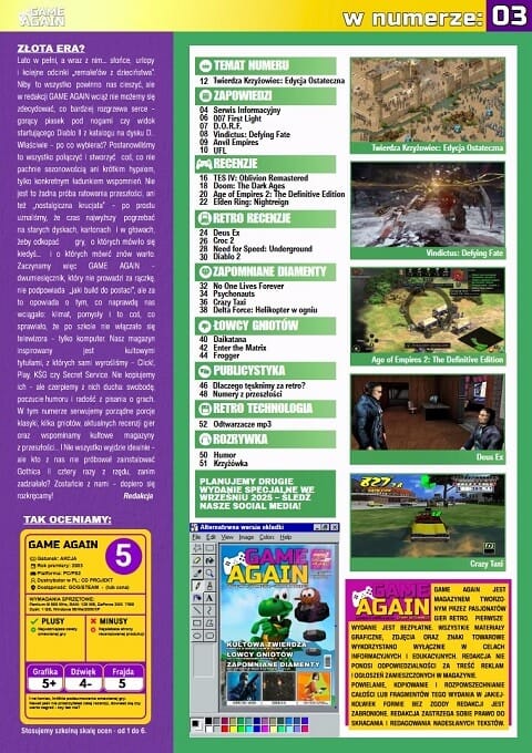 „Zaczynamy więc GAME AGAIN – dwumiesięcznik, który nie prowadzi za rączkę, nie podpowiada „jaki build do postaci”, ale za to opowiada o tym, co naprawdę nas wciągało: klimat, pomysły i to coś, co sprawiało, że po szkole nie włączało się telewizora – tylko komputer.”