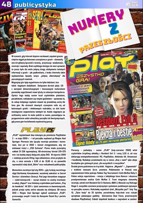 Zaledwie przeleciałem wzrokiem artykuły i nie jestem w stanie ocenić ich poziomu, na pierwszy rzut oka wydają się być jednak w porządku. Przeczytałem jedynie (co zrozumiałe 🙂 ) tekst o starych czasopismach o grach. W „Numerach z przeszłości” autor wspomina atmosferę początku lat 2000. i dwa kolorowe tytuły – Play i Click! Dlaczego akurat te dwa a nie 20 innych, nie wiem. Wiem za to że artykuł choć krótki nawet mi się podoba, choć nie ze wszystkimi tezami się zgadzam. Szczególnie z tą o Play’u: „Pierwsze lata łączyły recenzje pecetowe i konsolowe, lecz już w 2002 r. z konsol zrezygnowano, aby nie dublować treści z PSX Extreme”. Sorry ale nie sądzę, żeby taki gigant jak Axel Springer przejmował się małym niskonakładowym tytułem pokroju PSX Extreme. Zmieniono koncepcję Play’a, bo to pecety rządziły wtedy w domach polskich graczy i na nich się chciano skoncentrować. A z samych konsol w piśmie zresztą nie zrezygnowano, przerzucono je tylko do numerów specjalnych.