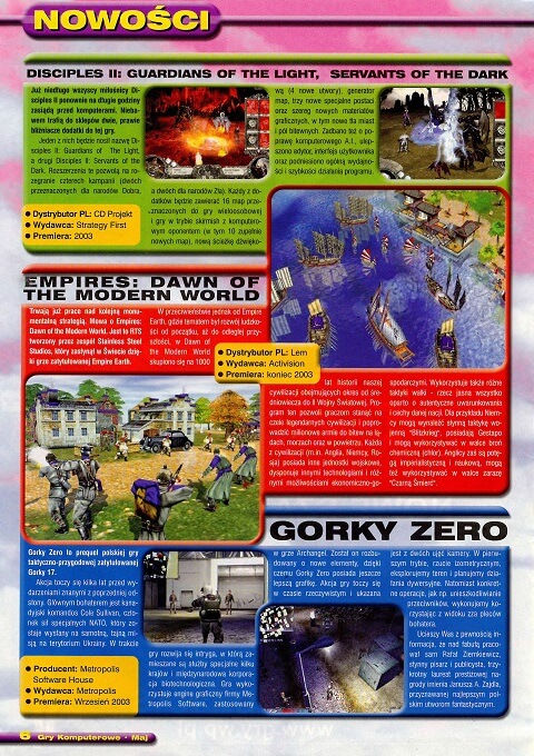 Kartka z kalendarza: magazyn Gry Komputerowe ukazywał się w latach 1993-2009 i był drugim po Computer Studio tytułem o grach wydawanym przez CGS. W sumie ukazały się 134 numery. Mimo iż nie był tak popularny jak tuzy branży, na przestrzeni lat wypracował własny styl i zgromadził sporą społeczność. Szczyt popularności Gier Komputerowych przypada na lata 1998-2001, kiedy to wchłonął PC Gamera Po Polsku, dobił do 100 stron i zatrudnił wielu młodych współpracowników. Pismo stało się bardziej młodzieżowe, oferowało bogatą zawartość (newsy, recki, poradniki, kąciki, publicystyka itd.) i edycje CD/DVD. Niestety, od 2002 roku coś się zaczęło zmieniać: magazyn chudł, ubywało rubryk, odchodzili ludzie. Rekompensowano to dołączaniem pełnych wersji, co w pewnym momencie upodobniło GK do popularnych ówcześnie tanich serii wydawniczych. W latach 2005-2009 magazyn ukazywał się coraz rzadziej, wreszcie w końcu 2009 ostatecznie padł. Jakby jednak nie patrzeć, ukazywał się bez przerwy przez 16 lat! Szacunek!
