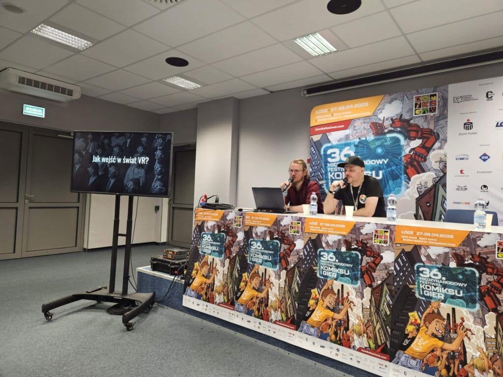 Zostajemy jeszcze godzinę – zapadła decyzja. Szybka kawa i powrót do F-ki. Tam już czekała wirtualna rzeczywistość w grach wideo. Przybliżali ją w przystępny sposób Łukasz Drozd i Damian Perka z MKwadrat Podcast. Dla mnie temat niezbadany, dla kolegi Marcina już trochę wyeksplorowany. Może kiedyś się zdecyduję, zbieram na tę okazję zapasy imbiru i mięty, czekając na kolejne obniżki cen. Meta na start. A może ktoś inny nas zaskoczy.