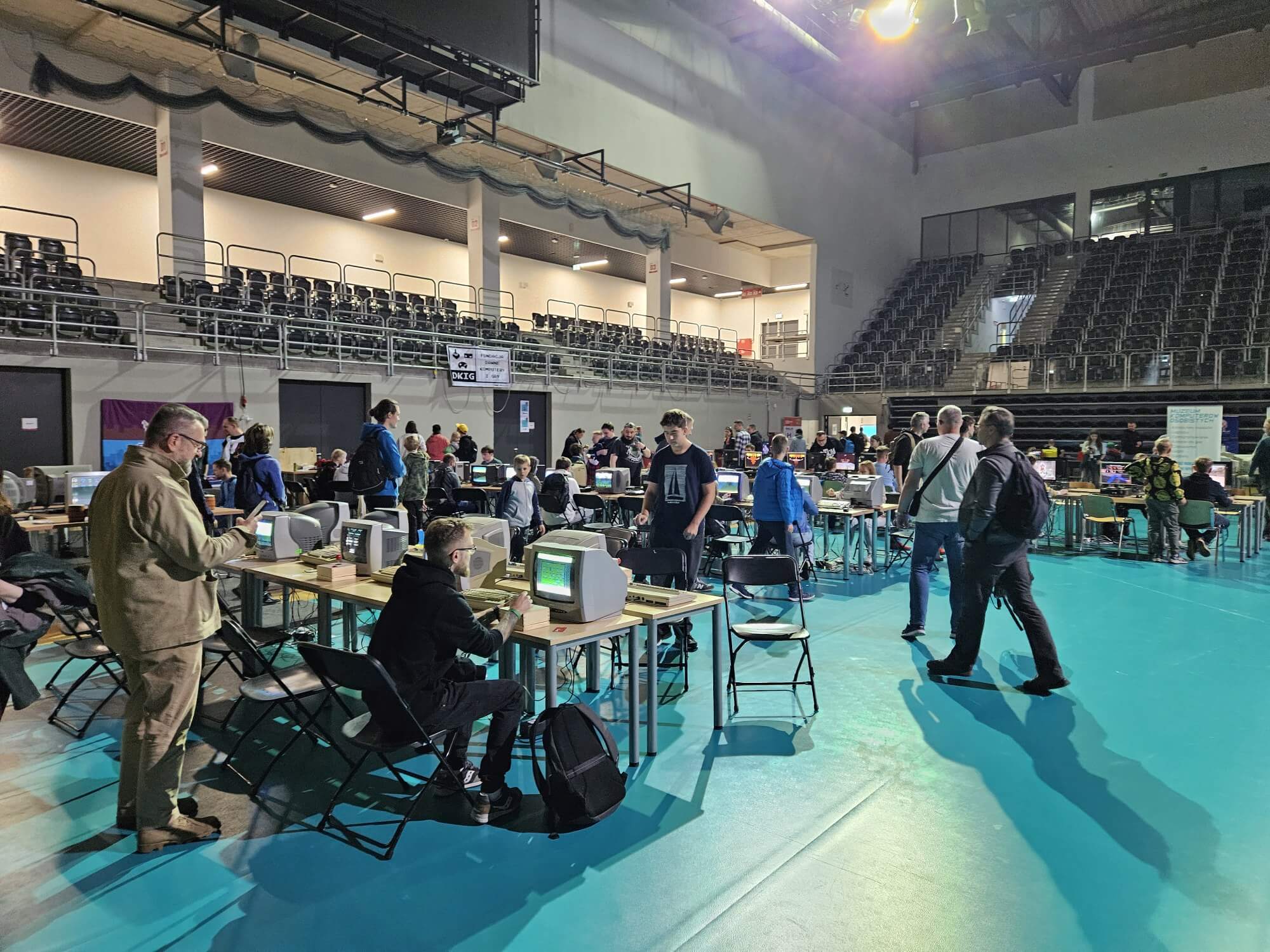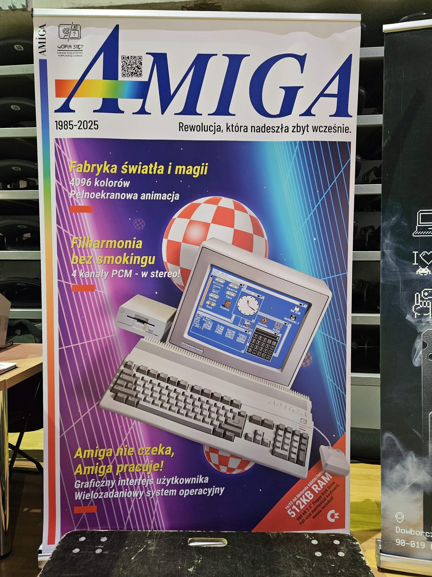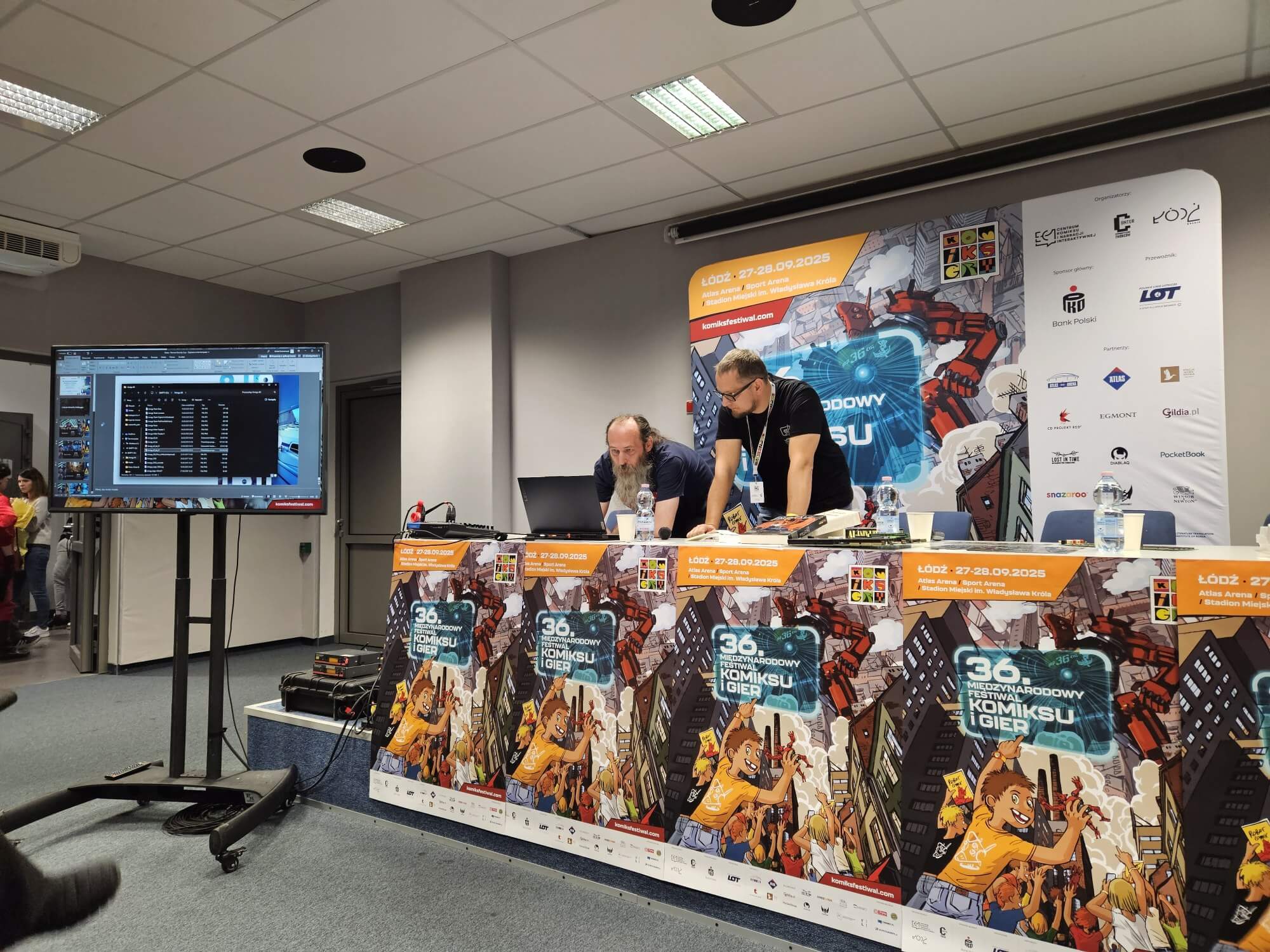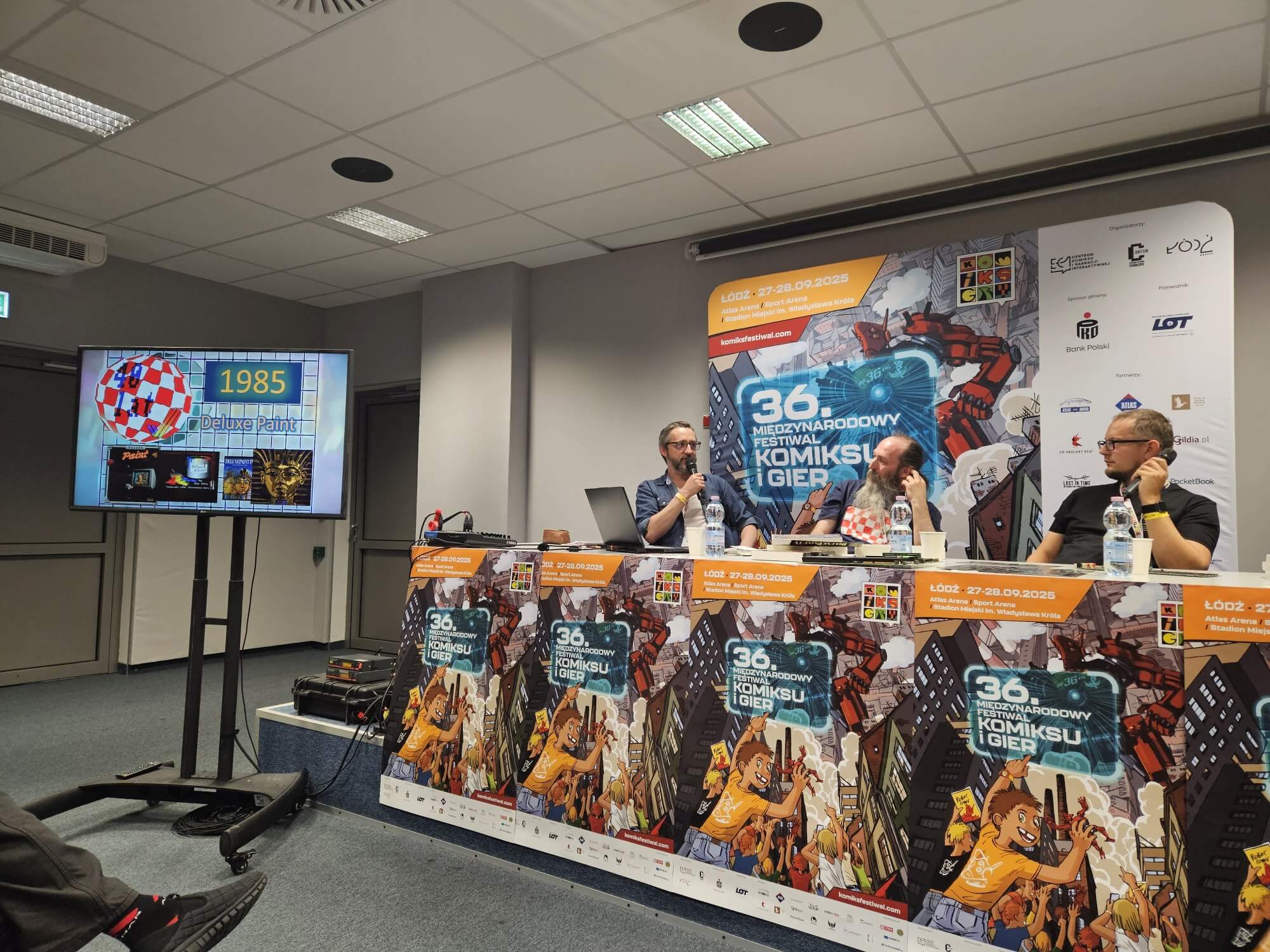 Czas płynął coraz szybciej, na salę przybyli Voyager (Bartek Dramczyk) i Tomasz „alt_” Marcinkowski. Z malutkim opóźnieniem dołączył do nich Michał Śledziński czyli Śledziu. Temat w tym składzie mógł być tylko jeden – 40. urodziny Amigi. Panowie zaprezentowali sporo ciekawych informacji i wspomnień, udało się też nie zrobić powtórki z podobnego spotkania, które odbyło się w ramach Pixel Heaven 2025. Szacunek, bo tak wiele już zostało powiedziane, historia w większości już zamknięta i opowiedziana. A jednak się da. Miłą niespodziankę stanowiły okolicznościowe pocztówki z okazji urodzin Amigi z podpisem Śledzia.