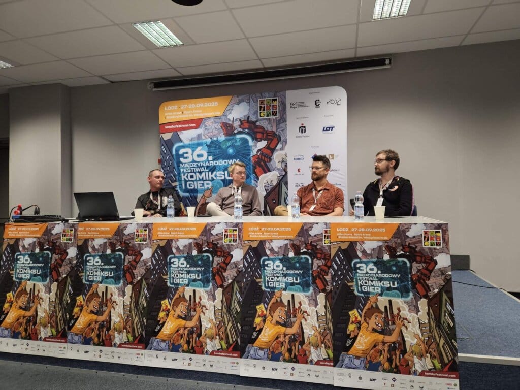 O 13.00 wzięliśmy głęboki oddech. Na Salę F wkroczyła flota zjednoczonych sił polskiego przemysłu książek o grach w składzie Bartłomiej Kluska, Zbigniew Jankowski, Marcin Kosman oraz niedawny debiutant w roli autora książki Arkadiusz „Dark Archon” Kamiński. W poszukiwaniu dobrych książek o grach wideo pytania zadawał i dyscypliny pilnował bezwzględnie Bartłomiej Kluska. Przyznam, że jako czytelnik jego Listów do Internetu nie przypuszczałem, że taki srogi z niego moderator. Padło kilka ciekawych tez na temat początków działalności wydawniczej, procesu pozyskiwania licencji, potencjału rynku książek o grach (optymistyczne) i czynników sukcesu. A także o sposobie pozyskiwania tematów.