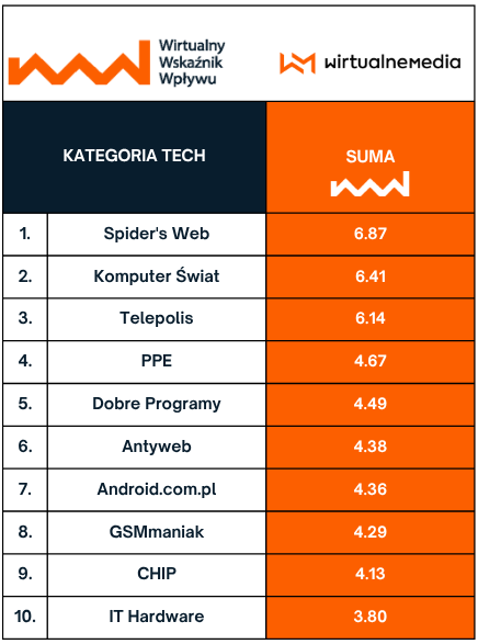 Nas może zainteresować kategoria nie LIFESTYLE, nie BIZNES, tylko TECH, w wynikach tego badania. A konkretnie… czwarta pozycja.
