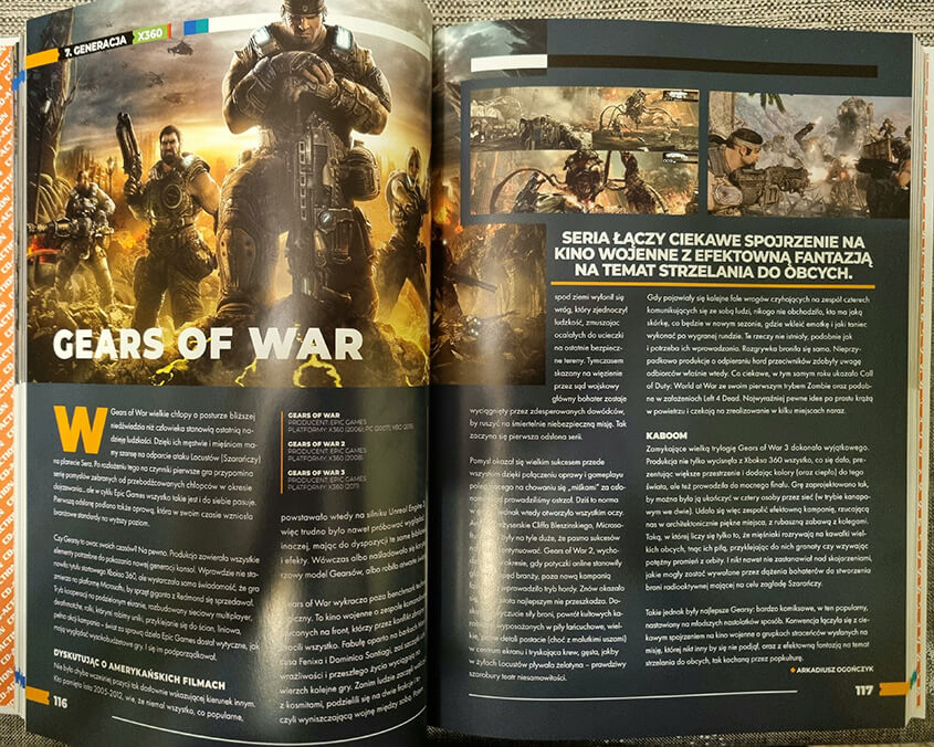 Ale na szczęście/nieszczęście autorzy zrobili mi psikusa i tym razem wprowadzili sporo zmian. Poprzednio całość została podzielona na poszczególne lata, rozgrodzone dwustronicowymi polecajkami, a każda gra miała dla siebie dwie strony. Tym razem jest inaczej. Otóż mniej więcej połowę książki zajmują generacje. I tak poznajemy poszczególne konsole, które miały swoją premierę w wybranym okresie czasu. Każda opisana na czterech stronach, czasem dorzucony dodatkowy artykuł na temat akcesoriów (np. Kinect, PS Move). Potem szybki przegląd najlepszych gier, dobranych dość wybiórczo i na pewno nie wyczerpująco. Chociaż „gier” to nie do końca dobre słowo, bo często są to całe serie. I nie zawsze na dwóch stronach, a często na czterech. I fajnie.
