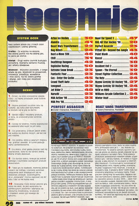 W numerze znajdziemy dwadzieścia pięć recenzji. Najlepiej wypada Gran Turismo ocenione na dziewięć. Najsłabiej VMX Racing, z notą równą dwa.