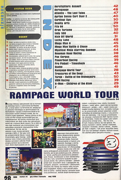Tak więc terminy oczekiwania na konwersje japońskich i amerykańskich gier do systemu PAL będą coraz krótsze. Pod koniec kwietnia ukazał się RESIDENT EVIL 2 zaś lada dzień do sklepów trafi europejska wersja GRAN TURISMO. Gra jest po prostu wspaniała, zaś jej niezaprzeczalnym plusem w stosunku do japońskiej wersji jest to, że dziwne znaczki używane w piśmie przez mieszkańców Kraju Kwitnącej Wiśni zastąpił język angielski. To nasza gwiazda numeru, której poświęcamy dwustronicową recenzję oraz Szkołę Przetrwania. Jest także TEKKEN 3, a ponieważ nie recenzujemy wersji NTSC, poświęciliśmy mu sporo miejsca w dziale zapowiedzi. Będąc przy recenzjach zauważycie zmiany w szacie graficznej – wykonaliśmy ukłon w stronne bardziej elastycznej formy, która umożliwi nam upchnięcie jeszcze większej ilości materiału na łamach pisma, a jednocześnie będzie bardziej atrakcyjna wizualnie.