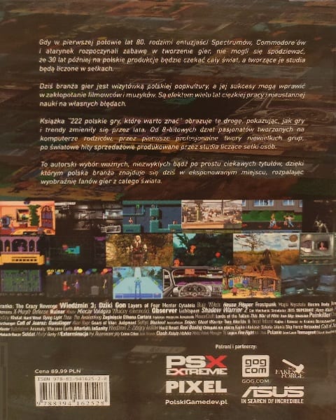 „222 polskie gry, które warto znać” to bogato ilustrowany album, zawierający tytułowe 222 pozycje z lat 1983-2019. Jest to druga książka Marcina Kosmana, po niezwykle popularnym „Nie tylko Wiedźmin”. Jako że czytelnicy tamtej pozycji narzekali na brak zdjęć, tym razem autor postanowił wydać album. Jego niewątpliwą zaletą jest twarda oprawa i błyszczący papier. Niestety każdą grę przedstawiono tylko jednym screenem, niemiłosiernie rozciągniętym na dwie strony oraz krótkim opisem, zawierającym podstawowe informacje o tytule. Jednak czasem trafiają się ciekawostki i anegdoty twórców.