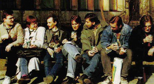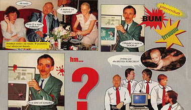 - Kopalny to Twój nick, potem jednak wyewoluował jako „wirtualny” członek redakcji. Z wyglądu i opisów to taki obibok, by nie powiedzieć menel spod budki z piwem. Kto wymyślił jego wizerunek i „historię”? Kopalny najpierw powstał spontanicznie jako kontrapunkt dla Naczelnego, a potem zaczął żyć własnym życiem. Ja postacie często tworzę mieszając jakieś kawałki ludzi, których znam w rzeczywistości, to nigdy nie są jakieś proste jednoznaczne klucze i odwzorowania, ale wybieram jakieś cechy, to ułatwia utrzymanie spójności postaci. Jak się okazało, że Kopalny wymaga jakiegoś wzorca, zacząłem się opierać na moim koledze z liceum, bardzo inteligentnym gościu, który uwielbiał pozować na troglodytę. Jak już potrzebny był jakiś wizerunek narysował go Wojtek Jabłoński w oparciu o swoje wyobrażenia, okazało się, ze zupełnie przypadkiem wyszła mu całkiem niezła karykatura tego mojego kumpla. - Czy Małolata w rzeczywistości istniała? ;) Małolata to już zupełnie swobodna kreacja, bez żadnych wzorców, aczkolwiek pamiętam, co było impulsem do jej wprowadzenia na łamy. Ona się pojawiła po jakimś zimowym wyjeździe, gdzieś napisałem, że Kopalny wrócił z nią z nart na Chopoku czy coś takiego. W tamtym roku rzeczywiście ferie zimowe spędziliśmy na nartach na Słowacji i obserwowałem z dość bliska grupę zajmujących sąsiednie pokoje warszawskich licealistów. Zakochany w Małolacie Kopalny to jakieś pokłosie tego co się między nimi działo, ale beż żadnych konkretów, taka uogólniona synteza, disneyowski Zakochany Kundel. - Jednym ze znaków rozpoznawczych Top Secret był komiks z redaktorami. Czy robiliście specjalnie sesje zdjęciowe do komiksu, czy fotki były brane z albumów rodzinnych? Kto robił zdjęcia, układał w komiks, wymyślał fabułę? Bardzo różnie. Pierwotnie komiksy (te głównie rysowane) robił Wojtek Jabłoński (znany raczej z Bajtka), ale zajmowało mu to kupę czasu, więc chociaż go to bawiło nie zawsze był chętny. Fotograficzne były prostsze produkcyjnie i łatwiejsze do szybkiego zaaranżowania. Czasem zdjęcia były wybierane z tego się znalazło pod ręką, przynajmniej raz były zrobione specjalnie do komiksu przez naszego fotografa.